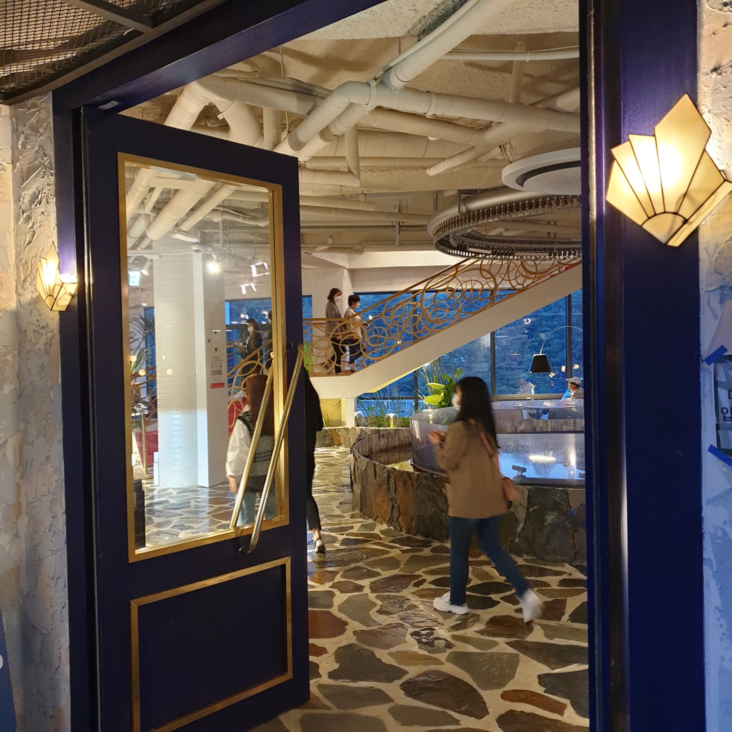 빠르끄 카페에 들어가면 성처럼 커다랗고 파란 문이 저희 반깁니다.